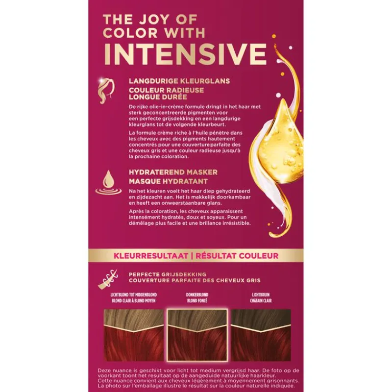 - Met hydraterend masker: na de haarkleuring voelt het haar diep gehydrateerd en zijdezacht aan. Het is makkelijk doorkambaar en heeft een onweerstaanbare glans.