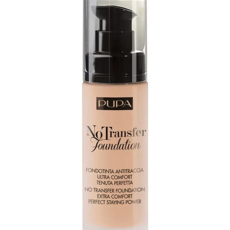 Pupa No Transfer/Antitraccia Foundation is een hydraterende foundation, die de gehele dag blijft zitten. Het zorgt voor een fluweelachtige huid en een egale teint. De huid wordt gematteerd en lijkt van binnenuit te stralen. De formule geeft niet af en voelt aangenaam aan. Voor alle huidtypen.