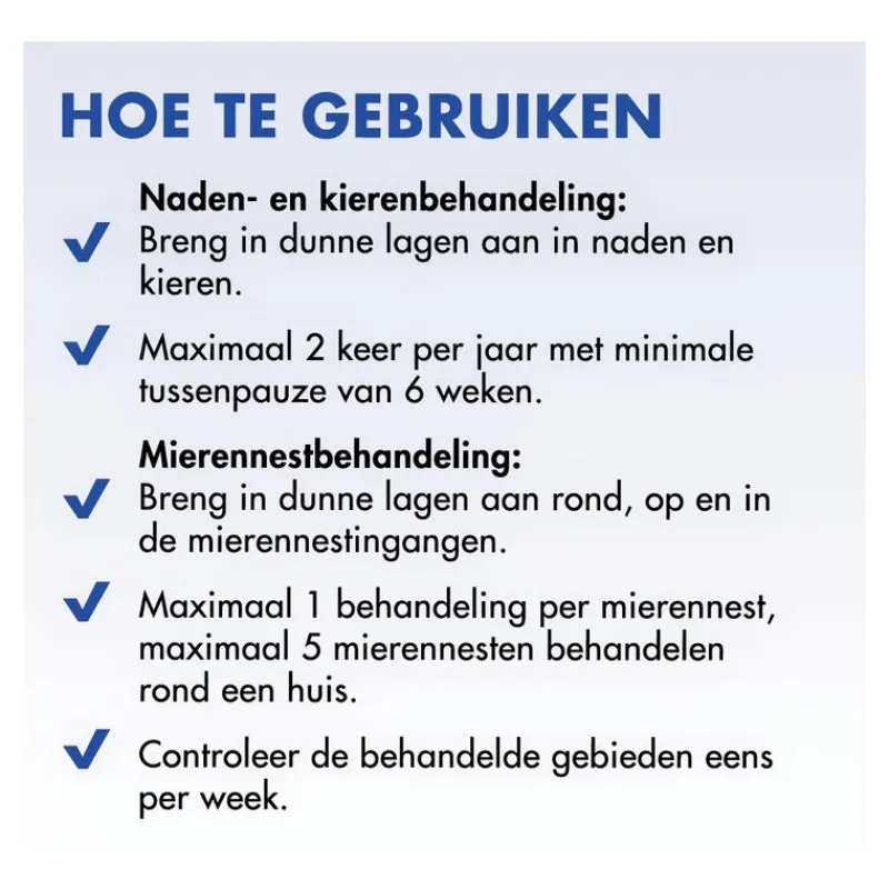 Gebruiksaanwijzing: Naden- en kierenbehandeling: dosering 20 g/m². Breng in dunne lagen aan in naden en kieren (onder meubels, in hoeken en andere schuilplaatsen). De behandeling kan worden uitgevoerd tot 2 keer per jaar met een minimuminterval van 6 weken tussen de toepassingen. Mierennestbehandeling: dosering 2 gram per mierennest. Maximaal 1 behandeling per mierennest, maximaal 5 mierennesten behandelen rond een huis. Breng in dunne lagen aan rond, op en in de mierennestingangen.Om de effectiviteit van de behandeling buitenshuis te optimaliseren, niet toepassen in geval van regen of wind. Om nesten te bereiken gelegen onder terrassen, het product zorgvuldig in scheuren en spleten of tussen de tegelvoegen strooien. Vermijd het wegvloeien van het product.Afgiftehoeveelheden van de strooikoker zijn:• grotere opening– 1 gram per 2 seconden• 1 medium opening– 1 gram per 6 seconden• 7 kleine openingen– 0,5 gram voor elke schudbeweging