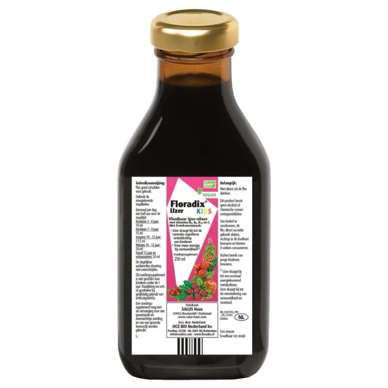 Floradix Kids ijzer-elixer bevat een goed opneembare en goed verteerbare vorm van ijzer en biedt ook belangrijke voedingsstoffen, zoals B-vitaminen (waaronder vitamine B12) en plantenextracten. Het ijzer in het vloeibare, vegetarische en vegan voedingssupplement draagt bij aan de vermindering van vermoeidheid. Vitaminen B1, B2, B6 en B12 activeert je natuurlijke energie in het lichaam en vitamine C verhoogt de ijzeropname. Bovendien draagt vitamine C bij tot de normale werking van het immuunsysteem. Floradix Kids IJzer-elixer is geschikt heeft een lekkere frambozensmaak en draagt bij aan de normale cognitieve ontwikkeling van kinderen. Floradix is al meer dan 50 jaar een vertrouwd ijzersupplement en is het grootste merk in ijzer in Nederland.