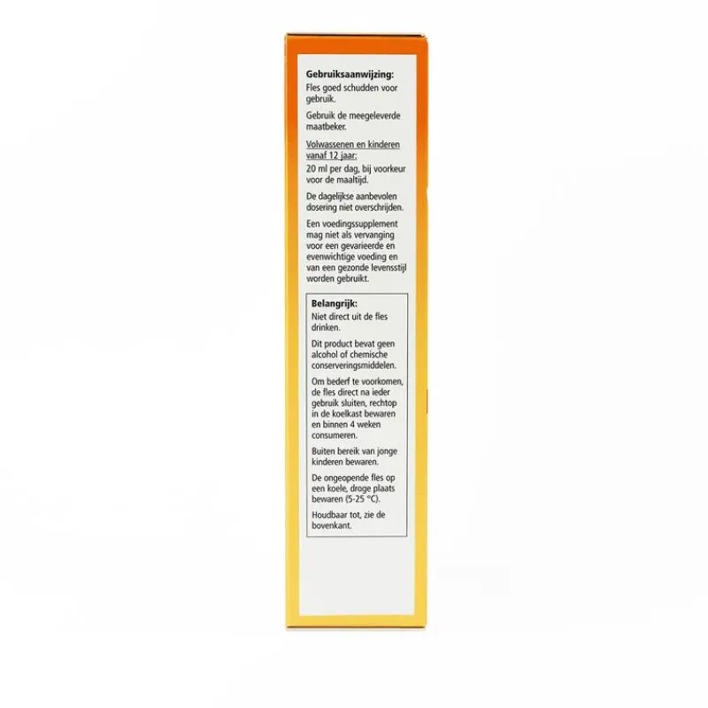 De dagelijkse aanbevolen dosering niet overschrijden. Voedingssupplementen mogen niet als vervanging voor een gevarieerde voeding worden gebruikt. Kies voor een gezonde levensstijl. Belangrijk: Niet direct uit de fles drinken. Dit product bevat geen alcohol of chemische conserveringsmiddelen.