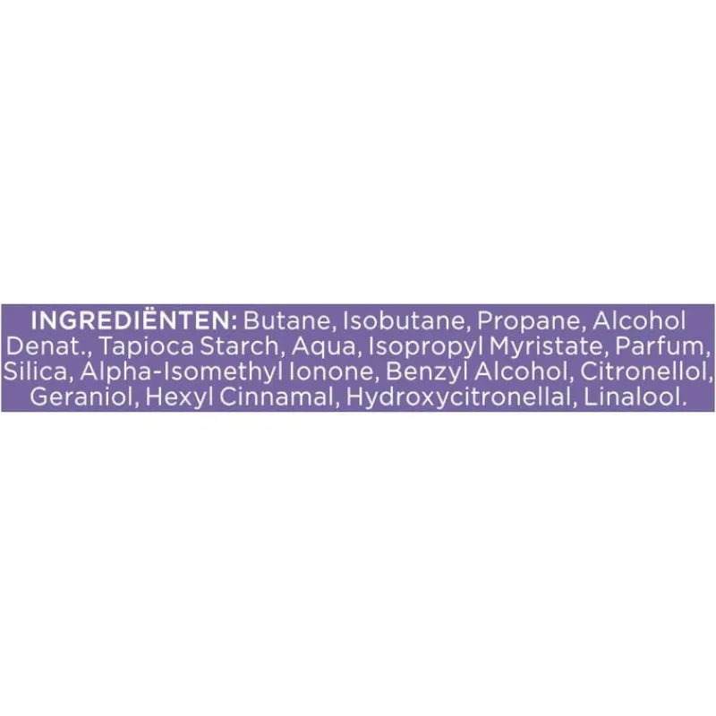 Butane, Isobutane, Propane, Alcohol Denat., Tapioca Starch, Aqua, Isopropyl Myristate, Parfum, Silica, Alpha-Isomethyl Ionone, Benzyl Alcohol, Citronellol, Geraniol, Hexyl Cinnamal, Hydroxycitronellal, Linalool.