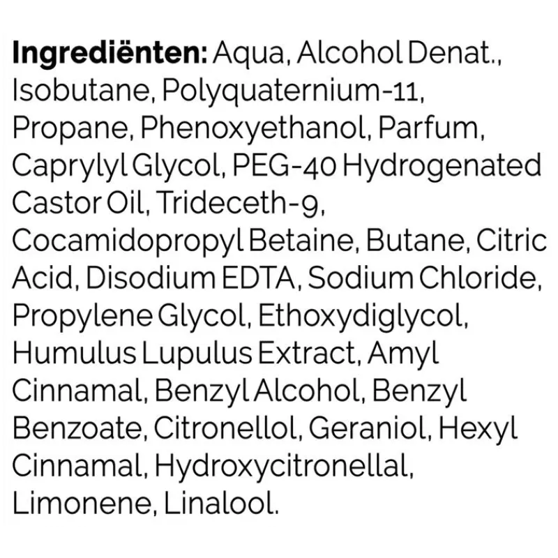 Aqua, Alcohol Denat., Isobutane, Polyquaternium-11, Propane, Phenoxyethanol, Parfum, Caprylyl Glycol, PEG-40 Hydrogenated Castor Oil, Trideceth-9, Cocamidopropyl Betaine, Butane, Citric Acid, Disodium EDTA, Sodium Chloride, Propylene Glycol, Ethoxydiglycol, Humulus Lupulus Extract, Amyl Cinnamal, Benzyl Alcohol, Benzyl Benzoate, Citronellol, Geraniol, Hexyl Cinnamal, Hydroxycitronellal, Limonene, Linalool.
