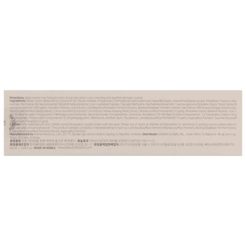 Water, Oryza Sativa (Rice) Extract (30%), Dibutyl Adipate, Propanediol, Diethylamino Hydroxybenzoyl Hexyl Benzoate, Polymethylsilsesquioxane, Ethylhexyl Triazone, Niacinamide, Methylene Bis-benzotriazolyl Tetramethylbutylphenol, Coco-caprylate/Caprate, Caprylyl Methicone, Diethylhexyl Butamido Triazone, Glycerin, Butylene Glycol, Oryza Sativa (Rice) Germ Extract, Camellia Sinensis Leaf Extract, Lactobacillus/Pumpkin Ferment Extract, Bacillus/Soybean Ferment Extract, Saccharum Officinarum (Sugarcane) Extract, Macrocystis Pyrifera (Kelp) Extract, Cocos Nucifera (Coconut) Fruit Extract, Panax Ginseng Root Extract, Camellia Sinensis Leaf Extract, Monascus/Rice Ferment, Pentylene Glycol, Behenyl Alcohol, Poly C10-30 Alkyl Acrylate, Polyglyceryl-3 Methylglucose Distearate, Decyl Glucoside, Tromethamine, Carbomer, Acrylates/C10-30 Alkyl Acrylate Crosspolymer, 1,2-Hexanediol,Sodium Stearoyl Glutamate, Polyacrylate Crosspolymer-6, Ethylhexylglycerin, Adenosine, Xanthan Gum, Tocopherol, Lactobacillus/Rice Ferment, Aspergillus Ferment, Saccharomyces/Rice Ferment Filtrate.