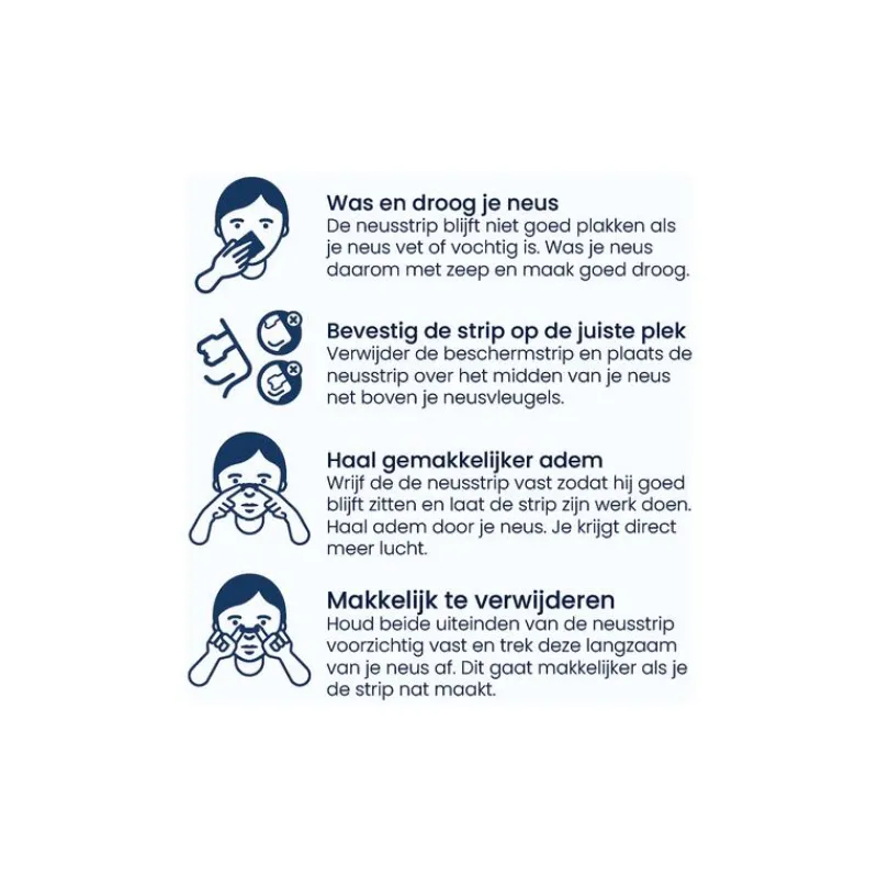 De huidvriendelijke kleefstrip bevat twee buigzame strookjes, waarmee je de strip eenvoudig over de neusbrug plakt. De strip tilt de neusvleugels extra stevig op, waardoor de neusgangen zich openen en je direct meer lucht krijgt. Deze verbeterde luchtstroom kan snurken door een verstopte neus helpen verminderen of zelfs helemaal laten verdwijnen.