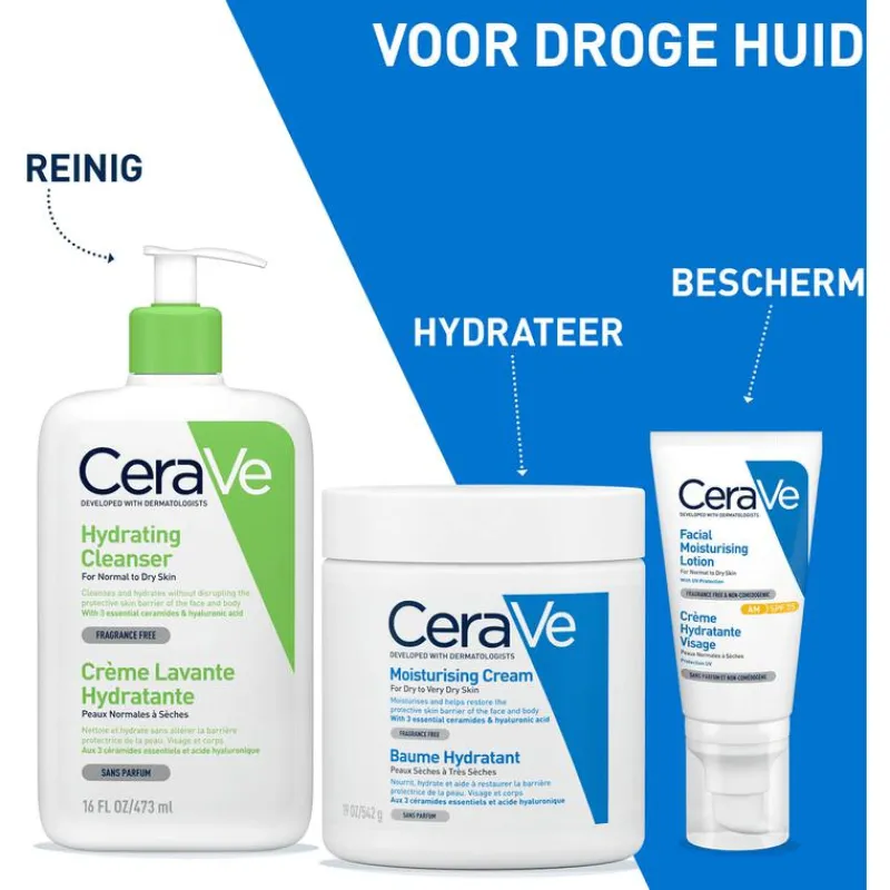 Niet-schuimende textuur, reinigt en hydrateert de normale tot droge huid. Een hydraterende reiniger die de onzuiverheden, make-up en ander vuiligheid verwijdert van het gezicht en lichaam. Het is belangrijk om een formule te kiezen die de huidbarrière beschermt en respecteert, zonder deze uit te drogen. De hydraterende reinigingscrème van CeraVe is een zachte reiniger, die door de aanwezigheid van de ceramiden zorgt voor een versterking van de huidbarrière en laat de huid toe om zijn natuurlijke vocht vast te houden. Deze niet-comedogene wascrème voor het gezicht en lichaam is een effectieve en niet-irriterende manier om de verzorgingsroutine te starten voor een normale tot droge huid. Het bevat de MVE technologie die de huid voorziet van continue hydratatie gedurende de dag en nacht. Voor normale tot droge huid voor het gezicht & lichaam