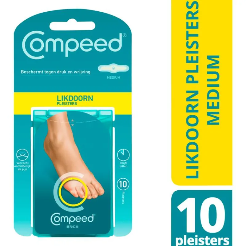 COMPEED® Likdoornpleisters bieden directe pijnverlichting, snellere genezing en blijven meer dan 24 uur zitten*. De pleister beschermt tegen druk en wrijving en houdt de likdoorn vochtig en zacht zodat deze makkelijk te verwijderen is. Een likdoorn? Behandel ze dan sneller met COMPEED® De technologie met hydrocolloïde gel van COMPEED® absorbeert overtollig vocht en vormt een beschermend kussentje. De pleister verspreidt de druk van de blaar waardoor de pijn onmiddellijk wordt verlicht en de omstandigheden voor de genezing optimaal zijn.