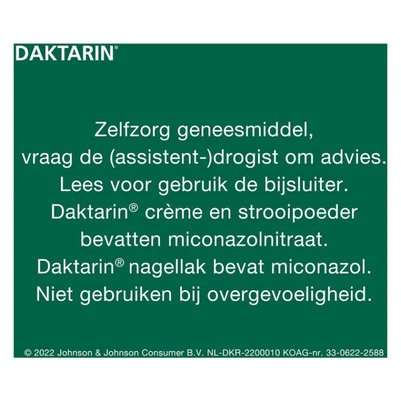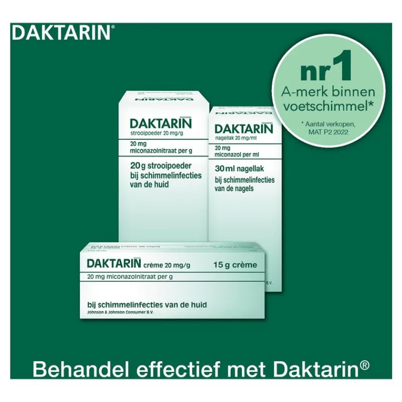 DAKTARIN® crème behandelt voetschimmel effectief en eenvoudig. Smeer de crème tweemaal per dag tot zo’n twee centimeter rondom de geïnfecteerde plekken op uw gereinigde, droge voeten. Herhaal deze behandeling, afhankelijk van uw klachten, twee tot zes weken zonder onderbreking tot minstens 1 week nadat alle zichtbare symptomen zijn verdwenen. DAKTARIN® crème bestrijdt schimmelinfecties, verlicht jeuk en laat kloven en schilfers verdwijnen. DAKTARIN® crème bevat miconazolnitraat en is een geneesmiddel aangewezen bij schimmelinfecties.