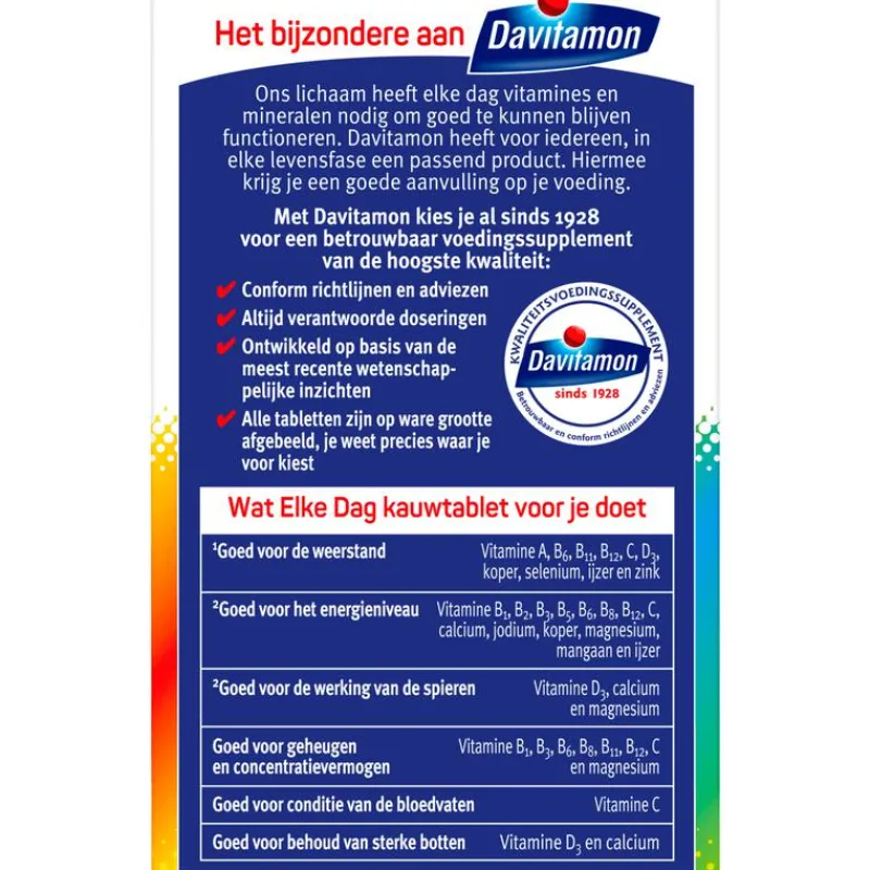 Davitamon Elke Dag kauwtabletten! De vertrouwde Elke Dag multivitamine maar dan in een kauwtablet. Davitamon Elke Dag is speciaal ontwikkeld voor de dagelijkse aanvulling van vitamines en mineralen, voor zowel man als vrouw. Het is een complete multivitamine met 22 essentiële vitamines en mineralen in een optimale dosering (tot 100% van de referentie innamen).