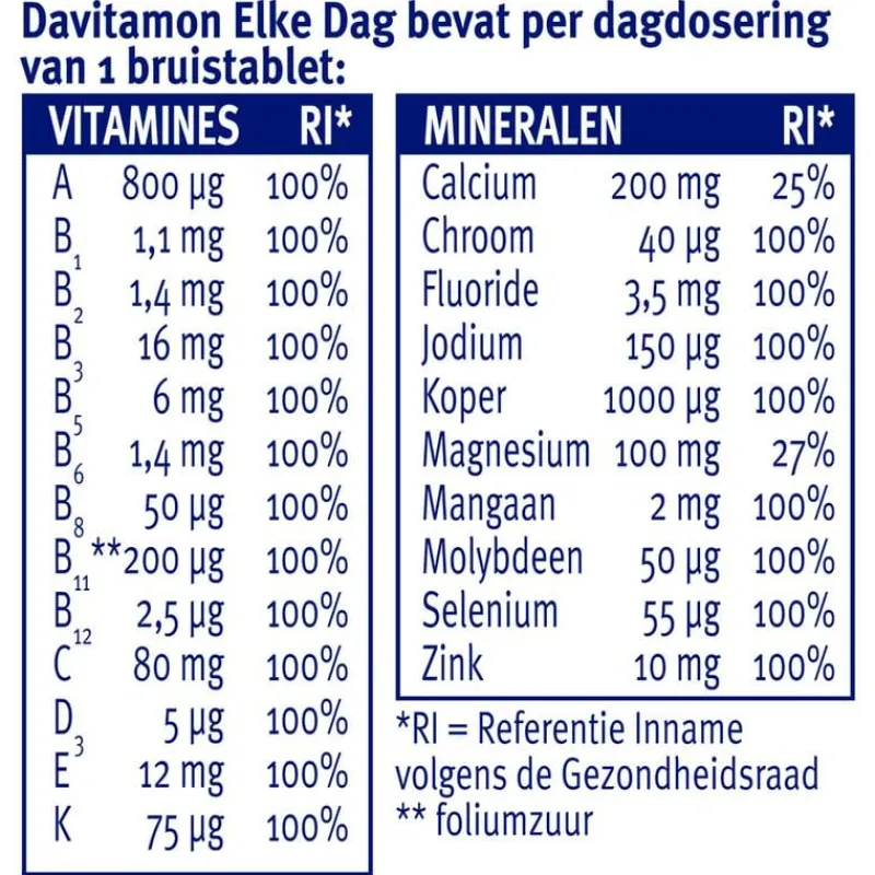 DAVITAMON ELKE DAG BRUISTABLETTEN zijn een aanvulling op de vitamines en mineralen die je lichaam dagelijks nodig heeft om goed te blijven functioneren. Door de verschillende vitamines en mineralen hebben deze tabletten een unieke werking. Zo zijn ze:• Goed voor de WEERSTAND (vitamine C)• Goed voor het ENERGIENIVEAU (vitamine C)• Goed voor de WERKING VAN DE SPIEREN (vitamine D)AANVULLING OP JE DAGELIJKSE VOEDINGJe lichaam heeft elke dag, het hele jaar door, vitamines en mineralen nodig om goede gezondheid te behouden. Gevarieerd en gezond eten volgens de adviezen van de Schijf van Vijf vormt de basis om hieraan te voldoen. Maar het lukt niet altijd om volgens deze adviezen te eten. Een aanvulling in de vorm van een voedingssupplement kan dan raadzaam zijn.ONTDEK DE VOORDELEN:• Complete multivitamine voor elke dag• Suikervrij• Met granaatappelsmaakDAVITAMON ELKE DAG BIEDT AANVULLING TOT 100% VAN DE DOOR DE GEZONDHEIDSRAAD AANBEVOLEN DAGELIJKSE HOEVEELHEID (ADH) OP BELANGRIJKE VITAMINES EN MINERALEN.DAVITAMON, SINDS 1928Om goed te kunnen blijven functioneren heeft ons lichaam elke dag vitamines en mineralen nodig. Daarom heeft Davitamon voor iedereen, in elke levensfase, een ander product. Zo krijg jij de juiste aanvulling op je voeding. Davitamon biedt al sinds 1928 betrouwbare voedingssupplementen aan van de hoogste kwaliteit.