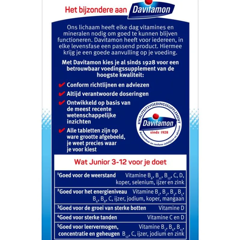 Davitamon Junior 3-12 Kauwvitamines Banaan is afgestemd op de specifieke behoeften van kinderen vanaf 3 jaar. Omdat groeien niet vanzelf gaat, is het belangrijk dat kinderen voldoende vitamines en mineralen binnen krijgen. Een voedingssupplement kan hierbij helpen. Davitamon Junior KauwVitamines Banaan bevat veel vitamine D3, 100% van de ADH, en is hierdoor: