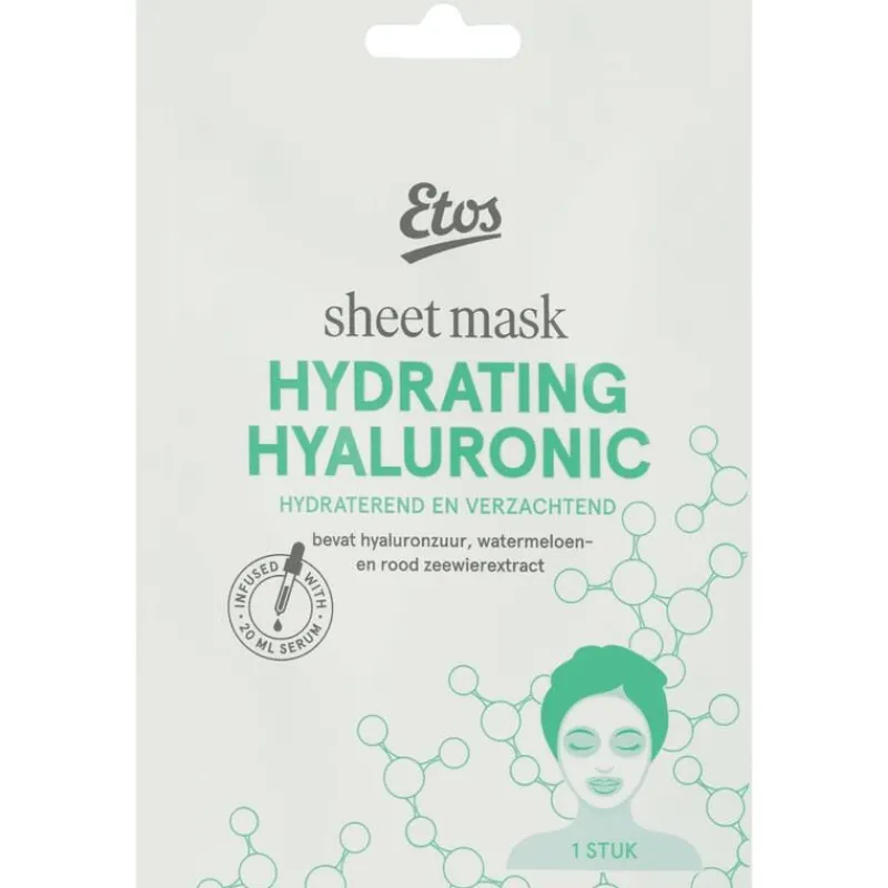 Help het natuurlijke vochtgehalte van de huid te verhogen met de Etos Hydrating Hyaluronic Sheet Masker. Deze hydraterende mix van hyaluronzuur, watermeloen- en rode zeewierextract verzacht en laat je huid verfrist en gerevitaliseerd achter. ]