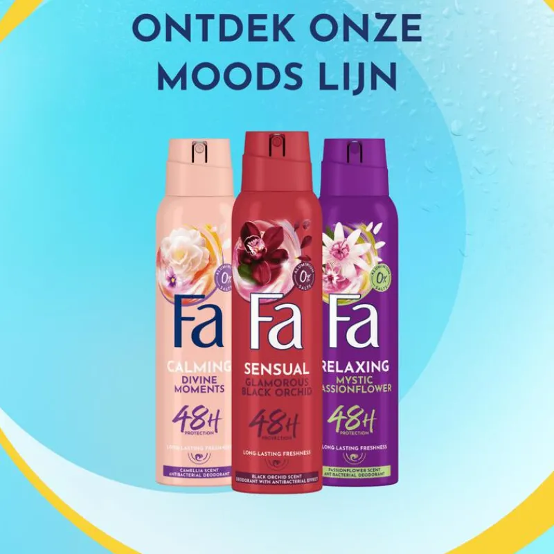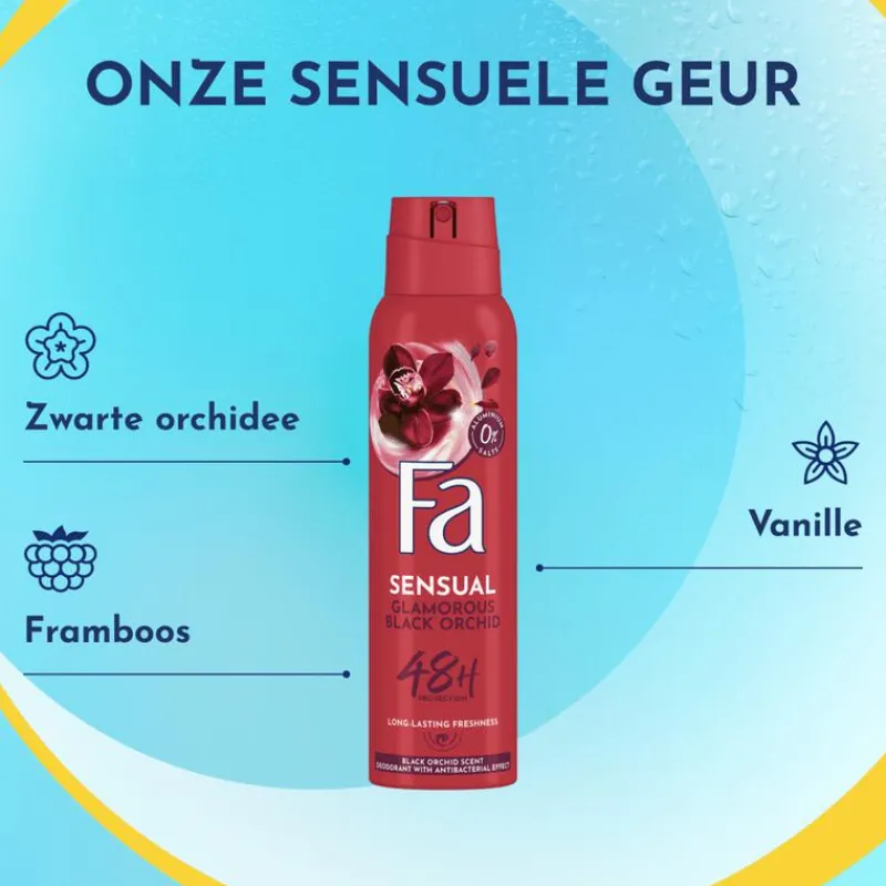 Ontdek Fa Glamorous Black Orchid deodorant spray met de geur van zwarte orchidee. De vegan formule biedt 48 uur bescherming tegen nare geurtjes en is vrij van aluminiumzouten.
