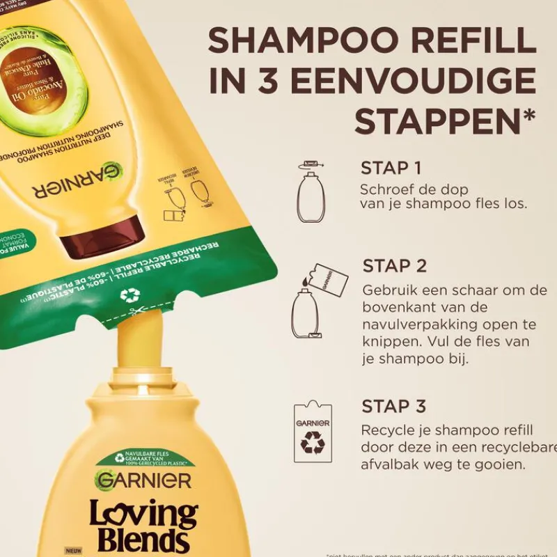 Minder plastic*, m€€r voordeel. Word ook een shampoo refiller! Garnier Loving Blends Avocado Olie & Shea Boter Shampoo Refill is jouw vertrouwde shampoo, maar nu hervulbaar. Garnier Loving Blends Avocado Olie & Shea Boter Shampoo Refill reinigt mild, voedt en verzacht krullen zonder te verzwaren. De iconische formule van Garnier Loving Blends Avocado Olie & Shea Boter shampoo is speciaal ontwikkeld voor zeer droog, golvend of krullend haar en is nu verrijkt met 10x meer geconcentreerd Avocado Olie**. Het haar is intens gevoed tot wel 6 weken***, zachter en gemakkelijker te stijlen en geschikt voor alle verschillende type krullen. *Deze Shampoo Refill is gemaakt van 60% minder plastic in vergelijking met het gebruik van onze 250ml fles shampoo. **Vs vorige formule. ***Gebaseerd op een 250ml fles en 3 gebruiken per week. Kan verschillen op basis van gebruik en lengte van het haar.