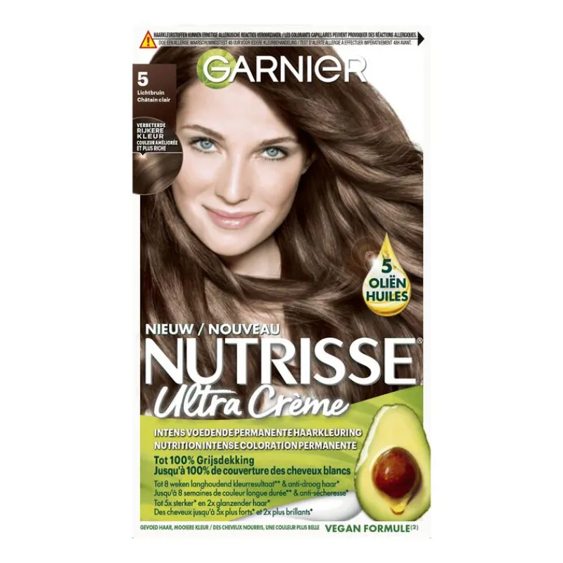 Garnier Nutrisse Ultra Crème is een intens voedende, permanente haarverf die tot 100% grijsdekking biedt. De formule van Nutrisse Ultra Crème geeft een verbeterde, rijkere kleur met behulp van de color boost technologie. Tijdens het kleuren voedt Nutrisse Ultra Crème het haar. De nabehandelende conditioner zorgt voor extra voeding na het kleuren. De conditioner is verrijkt met 5 fruitoliën: avocado-olie, olijfolie, kokosnootolie, arganolie en karité-olie. De conditioner herstelt de haarvezel, houdt de kleur vast en beschermt tegen droogheid. Het haar wordt glanzender en tot 5x sterker*. *Instrumentele test