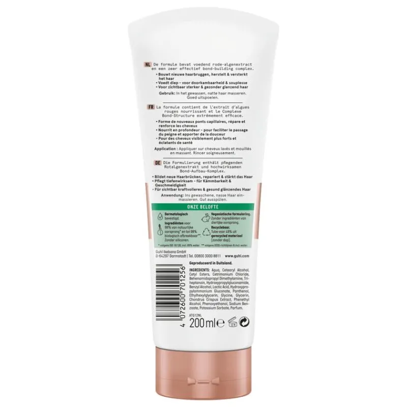 De Guhl Bond+ Restore Conditioner herstelt en versterkt zwaar beschadigd haar onmiddellijk – tot 15x sterker haar. De voedende conditioner dringt diep door in het haar en vormt nieuwe haarbruggen. Voedt het haar diep zonder het te verzwaren en ontwart het haar voor directe doorkambaarheid en intense souplesse. Voor zichtbaar sterker en gezonder glanzend haar.