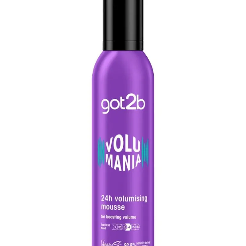 Met got2b Volumania Volumizing Mousse geef je je haar meer volume van de haaraanzet tot in de puntjes. Geniet van 2x meer volume met een sterke hold tot 24 uur lang. De formule is vegan* en bevat ingredienten met 92.8% natuurlijke oorsprong**. * Vrij van dierlijke producten