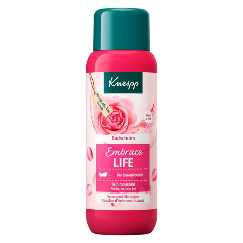 Ervaar pure luxe met het badschuim Embrace Life. De betoverende geur van rozenbloesem prikkelt je zintuigen, terwijl het verzorgende oliecomplex je huid na het baden heerlijk zacht en glad laat aanvoelen. Stap de badkamer binnen en laat je omhullen door de sensuele en vrouwelijke sfeer van deze bijzondere rozengeur. Met biologische rozenbloesem en verzorgend oliecomplex: (amandel, jojoba, argan). Versterkt je vrouwelijke en sensuele kant. Geur: De delicate rozenbloesems ruiken bloemig, vrouwelijk, warm en elegant.