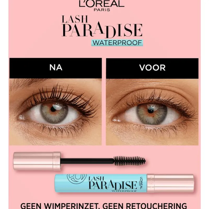 L’Oréal Paris Lash Paradise waterproof mascara geeft de wimpers onweerstaanbaar volume en spectaculaire lengte voor een open blik!