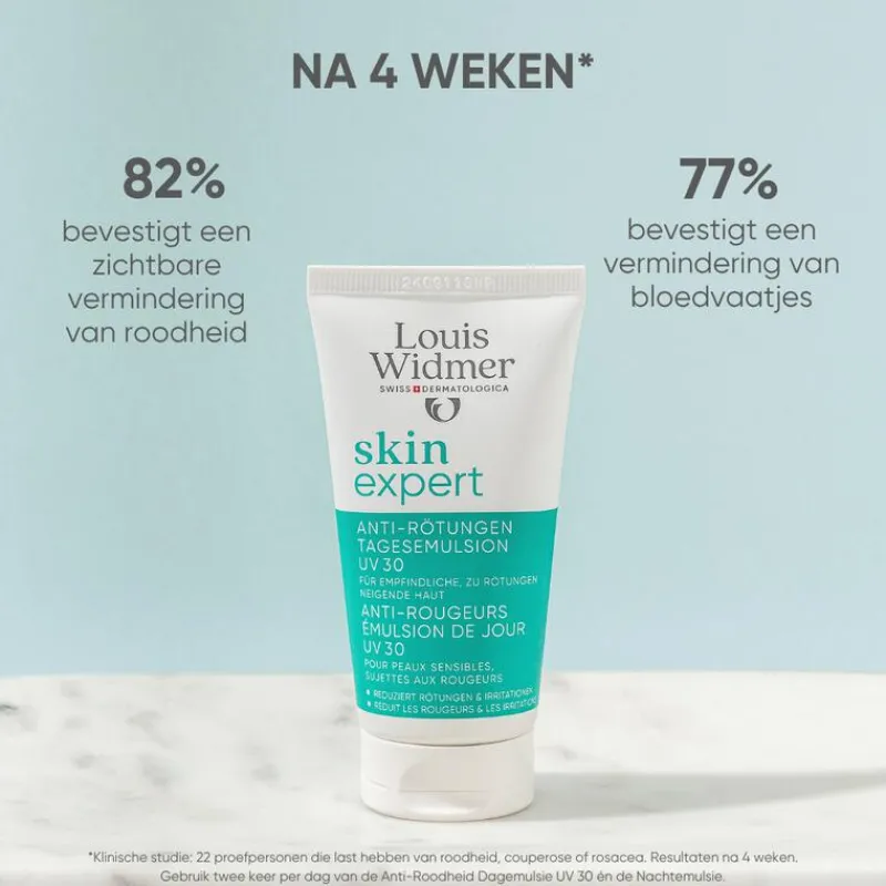 Louis Widmer skinexpert Anti-Roodheid Dagemulsie UV 30 beschermt en kalmeert de huid.