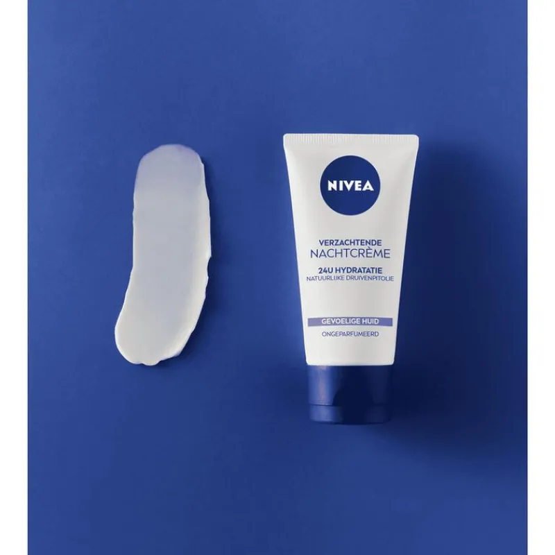 Kalmeer en voed de huid met NIVEA Essentials Sensitive Nachtcrème. De speciale formule van deze nachtcrème is samengesteld om de belangrijkste tekenen van een gevoelige huid te verminderen. Zo ervaar je minder roodheid, trekkerigheid en droogheid. De hydraterende crème biedt intensieve voeding op het moment dat je slaapt. Dat is namelijk hét moment waarop je huid het meest ontvankelijk is voor verzorgende bestanddelen. De formule is parfumvrij en vrij van kleurstoffen en parabenen. Dat maakt de hydraterende gezichtscrème niet alleen fijn voor de gevoelige huid. Ook de droge huid en gecombineerde huid zijn gebaat bij een verzorging met NIVEA Essentials Sensitive Nachtcrème. NIVEA Essentials Sensitive Nachtcrème bevat zoethoutextract om roodheid te kalmeren en je teint te egaliseren. Druivenpitolie hydrateert diep zonder een vettig gevoel achter te laten, terwijl vitamine B5 de huid extra rust geeft en irritaties vermindert. Zo ontwaak je met een ontspannen en rustige huid. • Vermindert roodheid, trekkerigheid en droogheid • pH-neutraal, parfumvrij en vrij van parabenen • Ondersteunt het herstellend vermogen van de huid • Brengt de huid tot rust gedurende de nacht • Hydrateert zonder een residu achter te laten • Voor de gevoelige, droge of gecombineerde huid