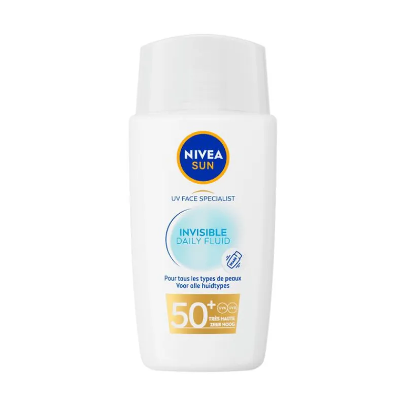 NIVEA SUN UV Face Invisible Daily Fluid SPF 50+ 40 ML. Deze ultralichte Zonnefluïde beschermt de huid van buitenaf tegen UVA/UVB-stralen en blauw licht, die verantwoordelijk zijn voor huidbeschadiging zoals vroegtijdige veroudering. Het beschermt de huid ook van binnenuit dankzij zoethoutextract. Deze natuurlijke antioxidant activeert het huideigen afweermechanisme om de cellen te beschermen en werkt tegen de effecten van vervuiling, zoals oxidatieve stress. De milde ultralichte Zonnefluïde met Niacinamide is niet vet, plakt niet en laat geen witte residuen achter. Het geeft 8 uur** lang een mat effect voor een niet-glimmende look. Laat de huid gehydrateerd aanvoelen en er gezond uitzien. Voor een optimaal resultaat schudden voor gebruik. Fles en dop gemaakt van 50% gerecycled plastic (label uitgezonderd). **Instrumentele test, 35 vrijwilligers.