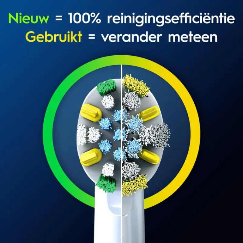 Echte Oral-B opzetborstels zijn ontworpen met nieuwe X-vormige borstelharen die reinigen op plaatsen waar ronde borstelharen niet bij kunnen. Dankzij de gebruiksindicator op de borstelkop veranderen borstelharen van groen naar geel om u te laten zien wanneer u hem moet vervangen om een 100% reinigende werking te behouden. Gegarandeerd geschikt voor Oral-B oplaadbare tandenborstels behalve Pulsonic en iO tandenborstels.