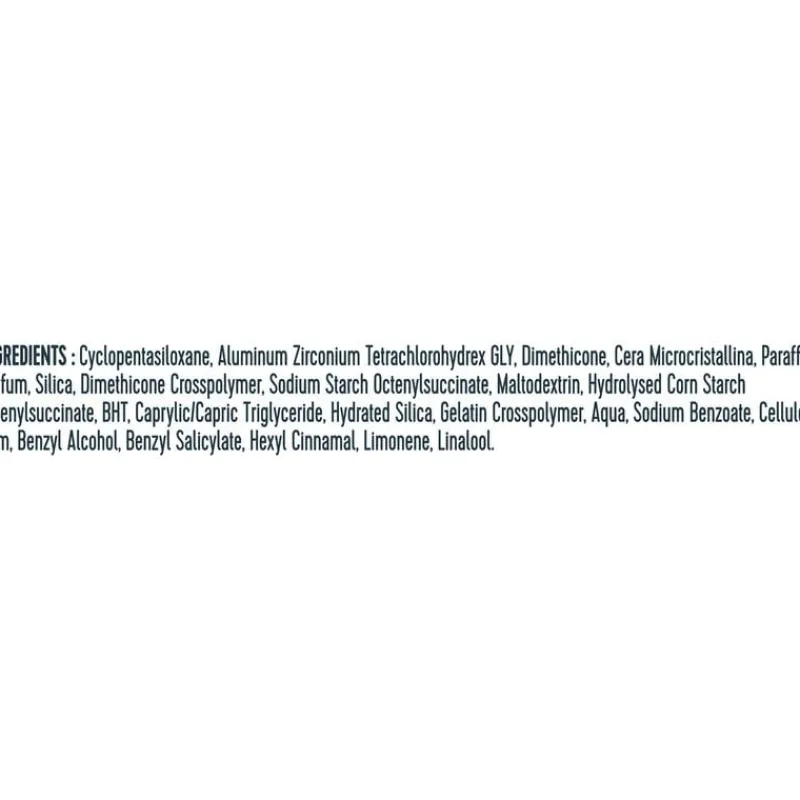 Cyclopentasiloxane, Aluminum Zirconium Tetrachlorohydrex GLY, Dimethicone, Cera Microcristallina, Paraffin, Parfum, Silica, Dimethicone Crosspolymer, Sodium Starch Octenylsuccinate, Maltodextrin, Hydrolysed Corn Starch Octenylsuccinate, BHT, Caprylic/Capric Triglyceride, Hydrated Silica, Gelatin Crosspolymer, Aqua, Sodium Benzoate, Cellulose Gum, Benzyl Alcohol, Benzyl Salicylate, Hexyl Cinnamal, Limonene, Linalool.