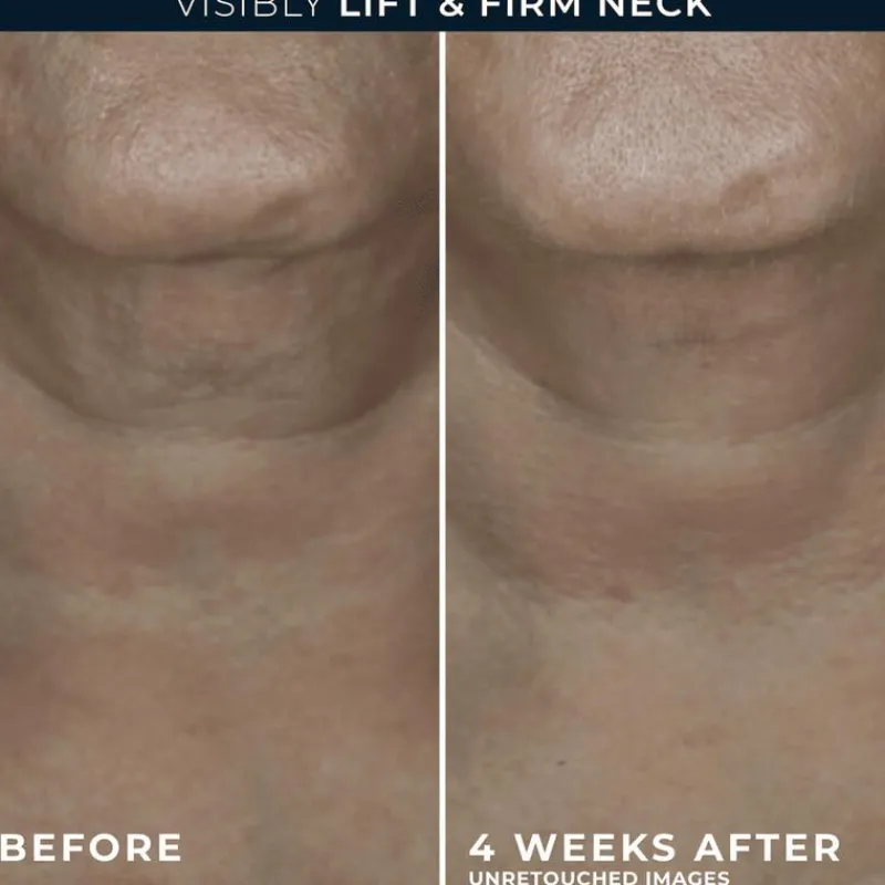 Na 1 week zijn horizontale lijntjes in de hals zichtbaar met 49% verminderd en heeft 97% een zichtbaar stevigere huid op gezicht en hals*. Deze niet-invasieve crème bevat hyaluronzuur om de huid zichtbaar voller te maken, terwijl retinol en swertiamarin de huid zichtbaar verstevigen en herstructureren.