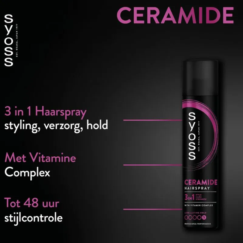 - lon- geïnspireerde Syoss Ceramide Haarspray, ontwikkeld met en getest door kappers, geeft het haar soepelheid en kracht – voor sterke en langdurige salon looks thuis.