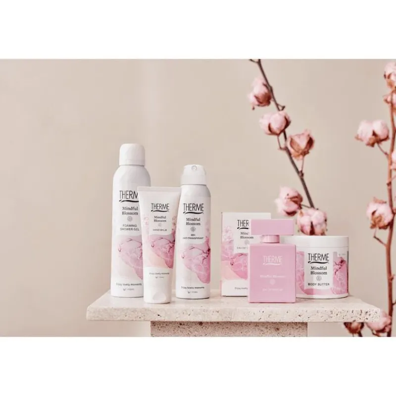 Therme Mindful Blossom is geïnspireerd op de vluchtige schoonheid van bloesem, een symbool voor zachtheid, tederheid en klein geluk. Creëer je eigen wellnessritueel en verwen je huid na het douchen met een Therme Mindful Blossom verzorgingsproduct.