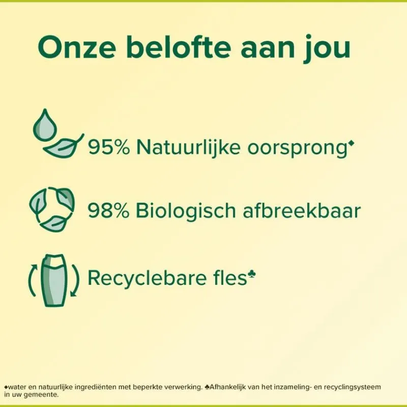 Deze vegan douchegel is gemaakt met ingrediënten van 95% natuurlijke oorsprong* en heeft een formule die voor 95% biologisch afbreekbaar is. De fles bestaat voor 30% uit gerecycled plastic en is volledig recyclebaar.
