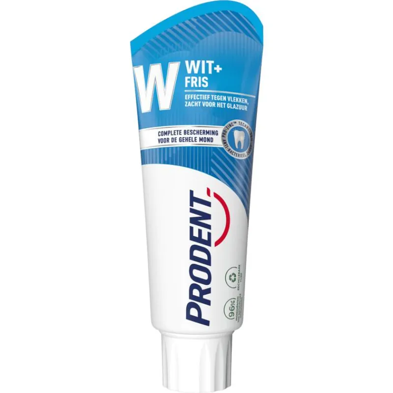 Prodent Wit + Fris Tandpasta zorgt dat de gehele mond dagelijks beschermd is en gezond blijft. Deze tandpasta voor wittere tanden verwijdert vlekken op je tanden effectief, maar is zacht voor het tandglazuur. De formule van deze tandpasta met antibacteriële Pro-Zinc Technologie bestrijdt bacteriën niet alleen op de tanden, maar ook op tandvlees, wangen en tong. De Pro-Zinc Technologie heeft namelijk een prebiotisch effect, die de natuurlijke afweer van de mond versterkt door de goede bacteriën te laten toenemen en de slechte te verminderen. Het resultaat is een 24 uur antibacteriële werking en 3x efficiëntere complete bescherming*, voor gezonde tanden, tandvlees, wangen en tong. De doeltreffende formule is geschikt voor het hele gezin. *In vivo meting van de vermindering van bacteriën op tanden, tandvlees, wangen en tong in vergelijking met een standaard fluoridetandpasta, na 28 dagen tweemaal daags gebruik.