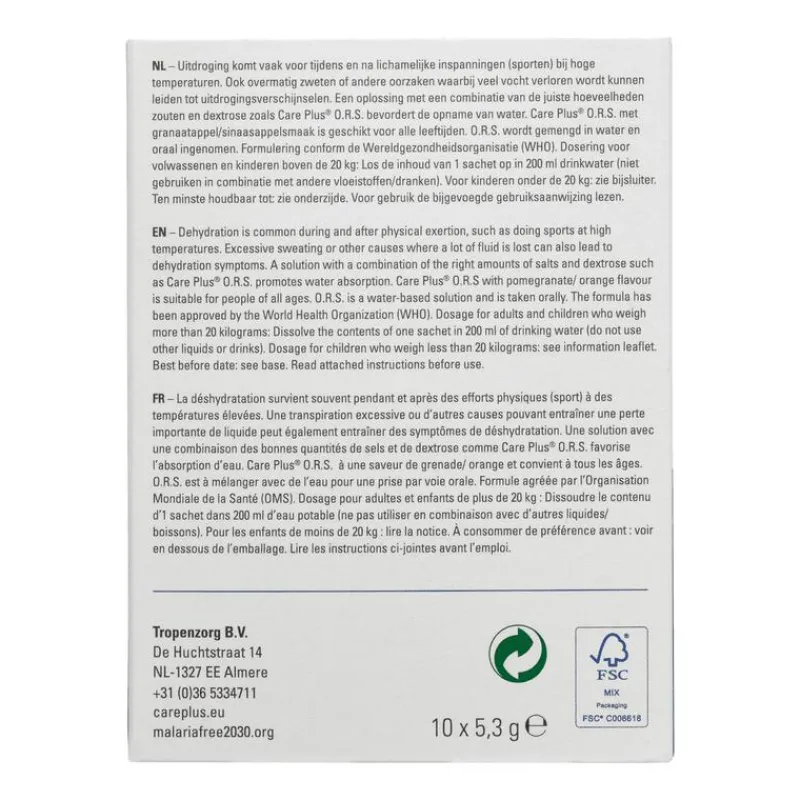 Care Plus O.R.S. Sachets Framboos is een glucose-zoutenpreparaat, dat de juiste hoeveelheid aan suikers en zouten bevat, zodat de opname van water wordt bevorderd. O.R.S. staat voor Oral Rehydration Salts en helpt je om uitdroging of dehydratatie te voorkomen. De O.R.S. zakjes helpen je glucose- en zoutgehalte weer op peil te krijgen. Care Plus O.R.S. Framboos zijn in het bijzonder geschikt tijdens en na lichamelijke inspanningen bij hoge temperaturen. O.R.S Framboos is een voedingssupplement en is geschikt voor alle leeftijden.