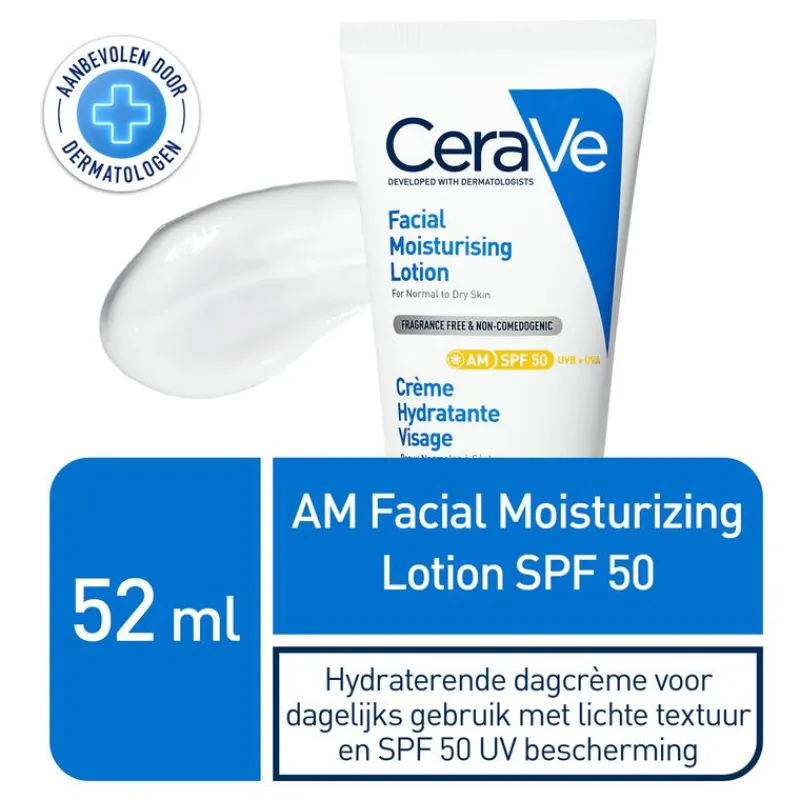 CeraVe Facial Moisturizing Lotion SPF 50 bevat 3 essentiële ceramiden om de huidbarrière te versterken, en breedspectrum zonbescherming om te helpen de huid te beschermen tegen dagelijkse UVA/UVB blootstelling in één stap. Deze dagelijkse moisturizer voor het gezicht combineert de herstellende eigenschappen van 3 essentiële ceramiden, met SPF 50 zonbescherming. Dit zorgt voor hydratatie, bescherming en het intact houden van de huidbarrière tijdens dagelijkse blootstelling aan de zon. De hydraterende crème helpt de huid beschermen tegen vervuilende deeltjes, met de hulp van MVE technologie: de lichte lotion zorgt voor een continue afgifte van hydraterende ingrediënten gedurende de dag, en zorgt voor hydratatie tot wel 24 uur. Daarnaast bevat de gezichtscreme Vitamine E en Niacinamide, om de huid gedurende de hele dag te kalmeren en hydrateren.