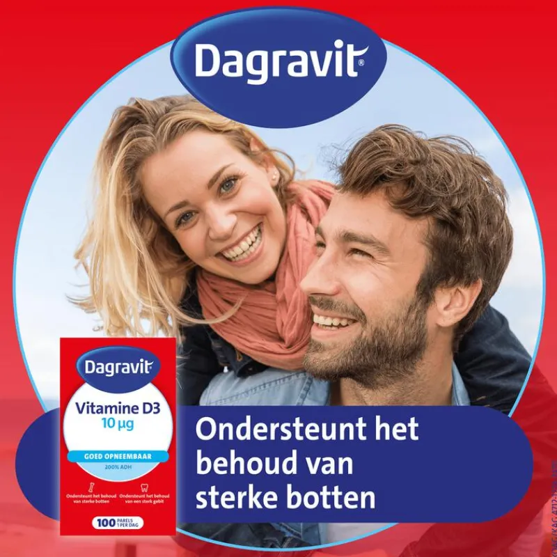 Haal alles uit je dag met Dagravit Vitamine D! Dagravit Vitamine D is een voedingssupplement in de vorm van parels. Het is speciaal ontwikkeld om in de verhoogde behoefte aan vitamine D te voorzien als aanvulling op de voeding, bij het ouder worden, bij onvoldoende blootstelling aan de zon of bij een donkere huidskleur.