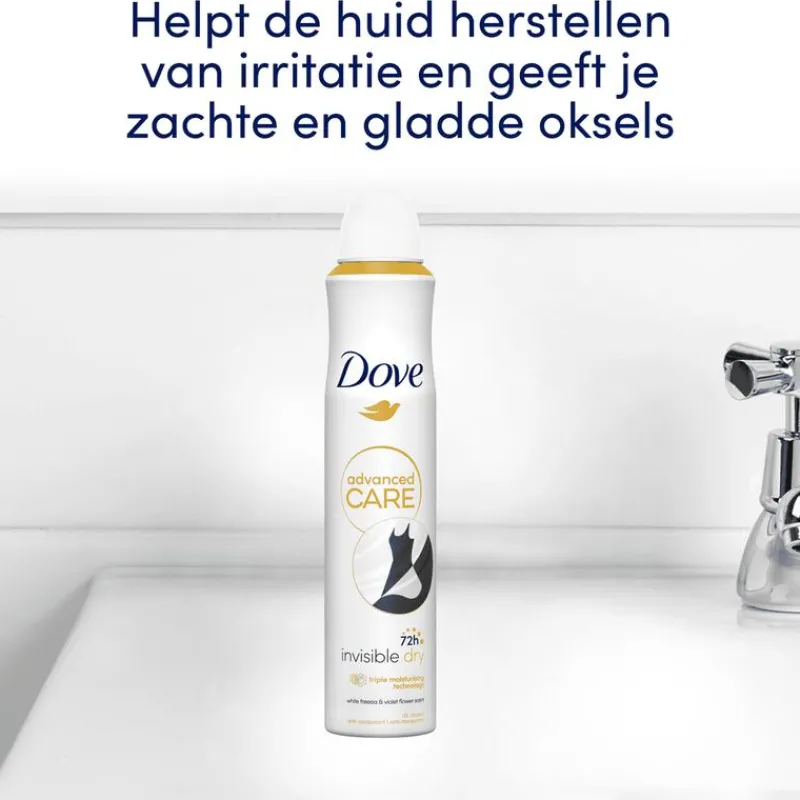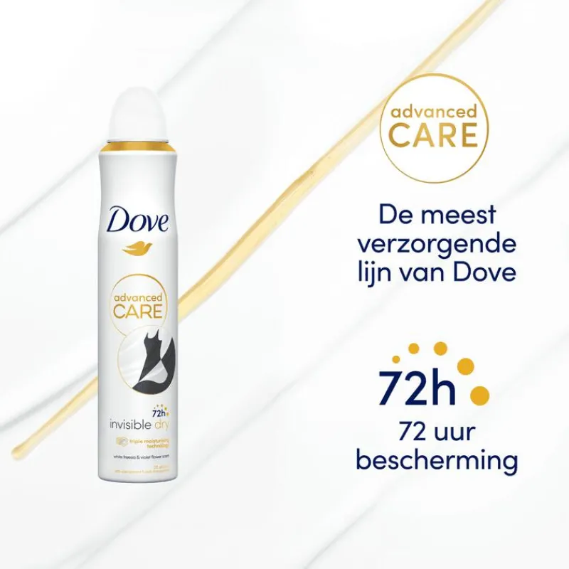 DOVE ADVANCED CARE INVISIBLE DRY ANTI-TRANSPIRANT DEODORANT SPRAY HEEFT EEN HEERLIJKE GEUR VAN WITTE FRESIA EN VIOOLTJES EN BESCHERMT ZOWEL JE OKSELS ALS JE KLEDING.