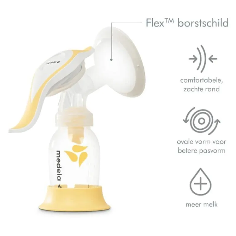 Daarnaast is deze kolf eenvoudig uit elkaar te halen en schoon te maken. De vernieuwde Medela Harmony is uitgerust met het unieke Medela Flex™ borstschild voor meer melk en meer comfort tijdens het kolven. Het Medela Flex™ borstschild heeft een wijdere openingshoek van 105°, wat voor een betere pasvorm zorgt. Dit helpt voorkomen dat de melkkanalen samengedrukt worden. Dit levert meer melk op en zorgt voor betere leging van je borsten.