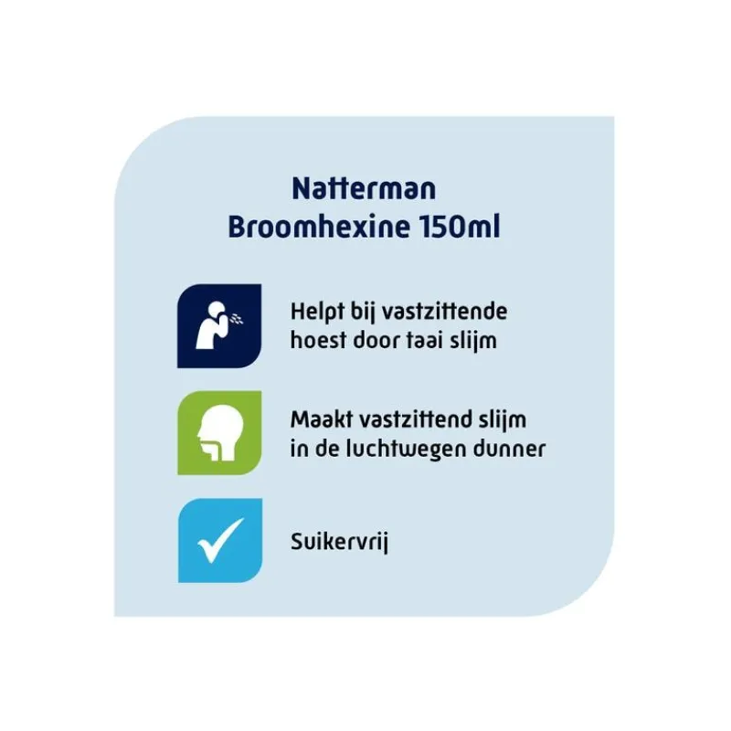 #Wees bedacht op een toename vrijkomend slijm in de luchtwegen. #Bij aanhoudende hoestklachten, terugkerende hoestklachten of een toename van de hoestklachten, raadpleeg arts.#Gelijktijdig gebruik van broomhexine en antibiotica (amoxicilline, erythromycine, doxycycline, cefuroxim) leidt tot hogere antibioticaspiegels in het longweefsel.#Dit geneesmiddel kan een licht laxerend effect hebben.,