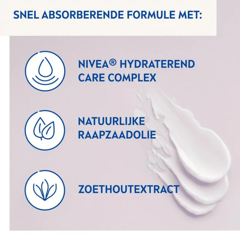 “Geef je gevoelige huid een goede start van de dag met NIVEA Verzachtende Dagcrème. Dit is een hydraterende crème die speciaal is ontwikkeld voor de gevoelige huid, droge huid en gecombineerde huid. De dagcrème heeft een diep hydraterende werking, maar bestrijdt ook effectief de tekenen van een gevoelige huid. Zo ervaar je minder trekkerigheid, droogheid en roodheid. De formule is helemaal parfumvrij en pH-neutraal, waardoor de dagcrème mild voor de huid is. Ook kleurstoffen en parabenen maken geen deel uit van deze verzorgende crème. Zo bied je je huid de milde verzorging die het verdient.NIVEA Essentials Sensitive Dagcrème bevat druivenpitolie, die diep hydrateert en snel in de huid trekt. Zoethoutextract kalmeert de huid en vermindert roodheid, terwijl SPF 15 beschermt tegen zonneschade. Zo bescherm je je huid tegen de schadelijke zon, om verdere huidirritaties te voorkomen. ” • Kalmeert de huid en vermindert roodheid• Zorg voor diepe hydratatie• Versterkt de natuurlijke weerstand van de huid tegen irritaties• Beschermt de huid met SPF 15• Voor de gevoelige, droge en gecombineerde huid• Zacht voor de huid, parfumvrij, pH-neutraal, vrij van parabenen en kleurstoffen