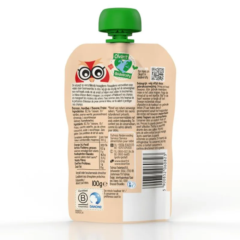 Olvarit Knijpfruit Banaan Aardbei, geschikt voor baby’s vanaf 6 maanden oud.