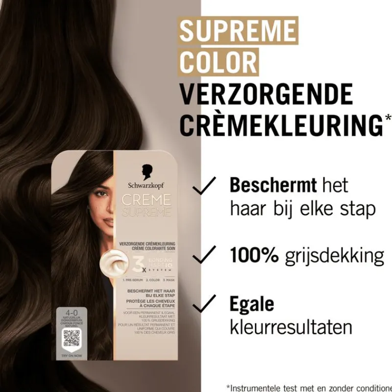 Meer dan 120 jaar geleden legde de Duitse chemicus en apotheker Hans Schwarzkopf de basis voor een merk dat sindsdien altijd voorop heeft gelopen op het gebied van innovatie. De combinatie van kwaliteitsingrediënten en de nieuwste haarverzorgingstechnologie, betrouwbaarheid, expertise en vakmanschap zijn de hoekstenen van alles wat het merk doet en waar het voor staat. Creme Supreme is de meest verzorgende permanente haarkleuring van Schwarzkopf, met het 3x Bonding HAPTIQ System dat het haar beschermt bij elke stap : voor, tijdens en na het kleuren.