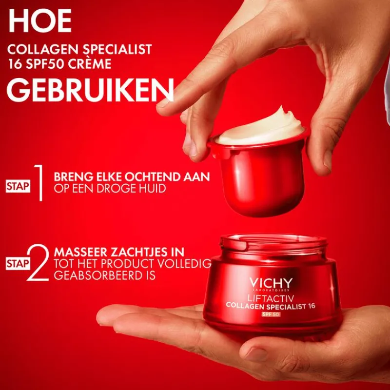 Met de leeftijd begint de productie van collageen af te nemen, wat de tekenen van huidveroudering versnelt, vooral in het gezicht. De experts van Vichy ontwikkelden Liftactiv Collagen Specialist 16 Dagcrème, verrijkt met de innovatieve Co-Bonding Technologie. Deze crème pakt 16 zichtbare tekenen van huidveroudering aan, waaronder wallen, donkere kringen, rimpels onder de ogen, kraaienpootjes, fijne lijntjes, stevigheid, verslapping, soepelheid, huidtextuur, tekenen van vermoeidheid, tonus, stevigheid, stralendheid, elasticiteit, hydratatie, gelijkmatigheid. Het resultaat: een stevigere, egalere en stralendere huid. Vichy Liftactiv Collagen Specialist 16 SPF50 is nu verrijkt met SPF50 en verkrijgbaar als handige navulling.