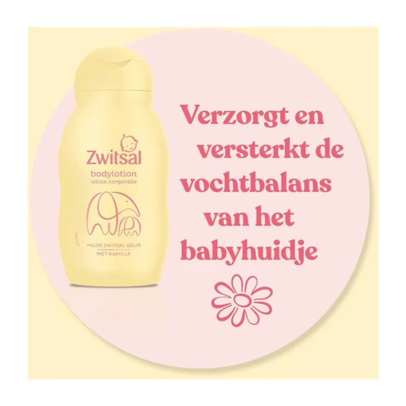 Zwitsal Baby Bodylotion biedt de meest pure verzorging voor het zachte en soepele babyhuidje. Deze verzorgende bodylotion heeft een vernieuwde formule met de milde Zwitsal-geur en kamille. De bodylotion hydrateert en beschermt het huidje met huideigen ingrediënten. Dit zijn bestanddelen die ook van nature voorkomen in de huid en daar belangrijk zijn voor het ondersteunen van de beschermende werking van de huid. Ze zijn belangrijk voor een goede barrièrewerking van de huid. Een gezonde huidbarrière zorgt dat vocht behouden wordt en beschermt tegen invloeden van buitenaf. Zo blijft het huidje knuffelzacht en weerbaar. Zwitsal Bodylotion is dermatologisch getest, bevat ingrediënten van natuurlijke oorsprong en bevat geen kleurstof.