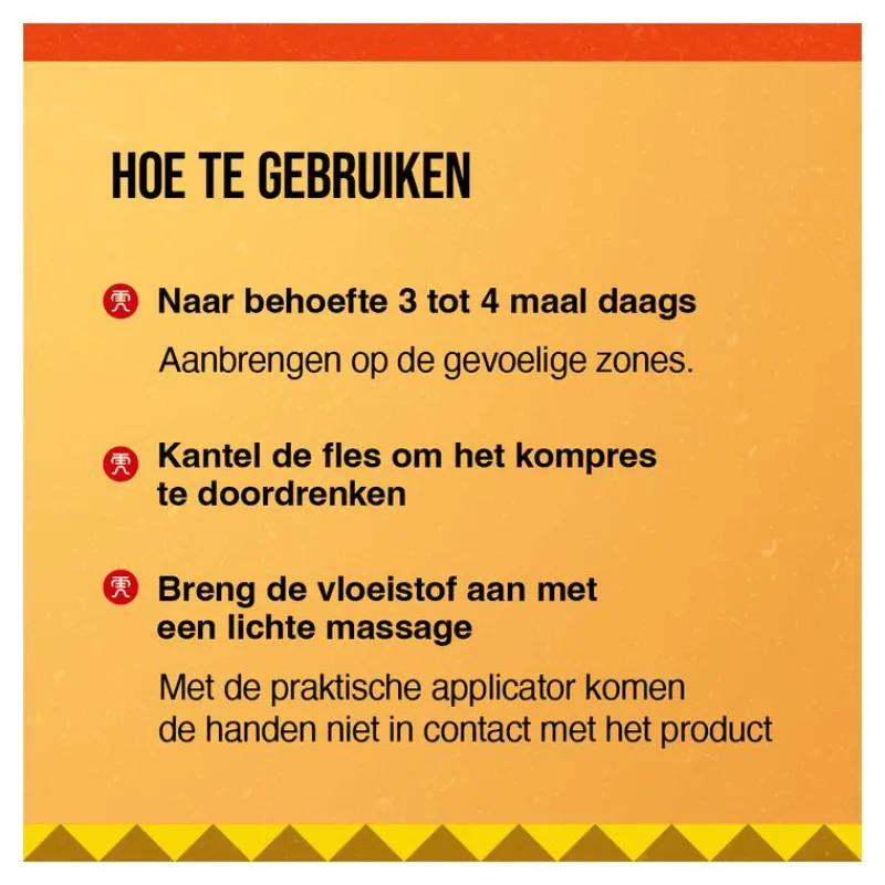 Naar behoefte 3 tot 4 keer per dag aanbrengen op de gevoelige zones. Kantel de fles om het kompres te doordrenken. Breng de vloeistof aan met een lichte massage.