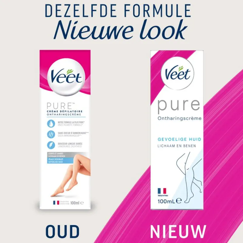 Ontdek de Pure ontharingscrème van Veet: een formule met 35% minder chemische ingrediënten* voor een zijdezachte huid met een frisse parfum. Deze verpakking bevat 1 creme tube 100ml en 1 spatel.* vergeleken met de vorige formule met dezelfde geurbasis