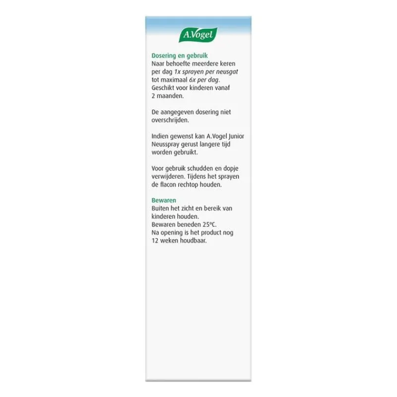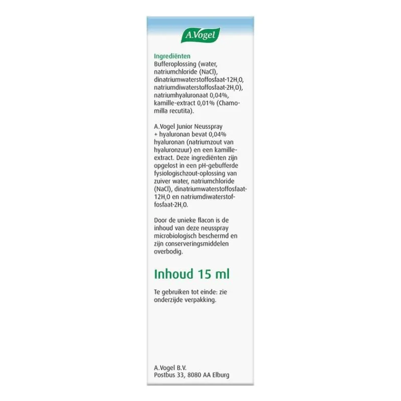 A.Vogel Junior Neusspray bevat hyaluronan en kamille. De neusspray helpt je kindje vrijer te ademen, ook tijdens het liggen en/of slapen. A.Vogel Junior Neusspray is verzorgend voor de neus. Het ondersteunt de bevochtiging en daarmee de natuurlijke functie van de neus.