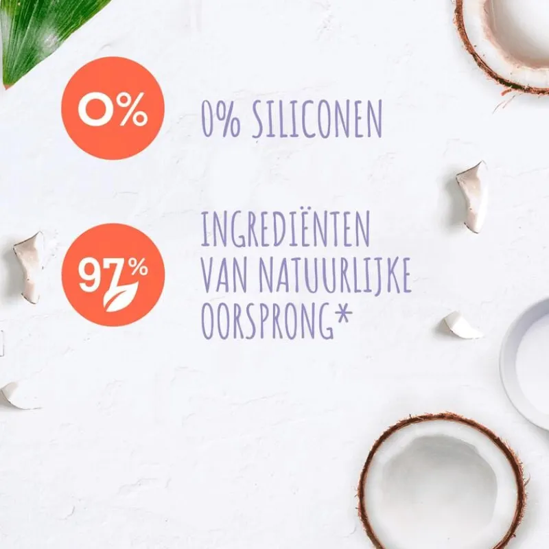 - Deze leave-in crème bevat geen siliconen en is verrijkt met kokosolie