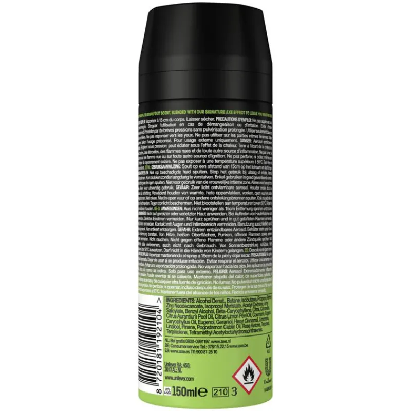 Breng fris blijven naar een hoger niveau met AXE Epic Fresh Deodorant Bodyspray. Leef het dagelijkse frisse leven. Je weet nooit wat er kan gebeuren, dus heb je een bodyspray nodig om de hele dag heerlijk te blijven ruiken. AXE Epic Fresh Deodorant Bodyspray met geurbestrijdende zink, verhoogd met 5% Zink-Zap technologie, stopt ongewenste lichaamsgeur en geeft je langdurige bescherming. Geniet 48 uur lang van de stimulerende frisse geur van grapefruit en tropische ananas. Wat er ook op je pad komt, met AXE ben je er klaar voor. De hele dag door.