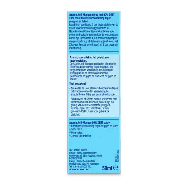 Azaron Anti-Muggen verre reis spray met 50% DEET biedt tot 9 uur effectieve bescherming tegen muggen en teken. Beschermt gemiddeld 9 uur tegen steken van de meest voorkomende muggensoorten in Nederland en 8 uur tegen tekenbeten. Voor sommige tropische soorten kan de werkingsduur korter zijn, gemiddeld 4 uur bescherming tegen de gelekoortsmug of denguemug (welke o.a. het Zikavirus kunnen overdragen) en 8 uur tegen de malariamug.